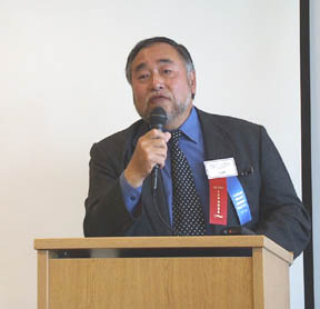 At the speechs conclusion, Udbye presented Wang with a World Trade Center Tacoma pin, which he affixed to his jacket lapel.