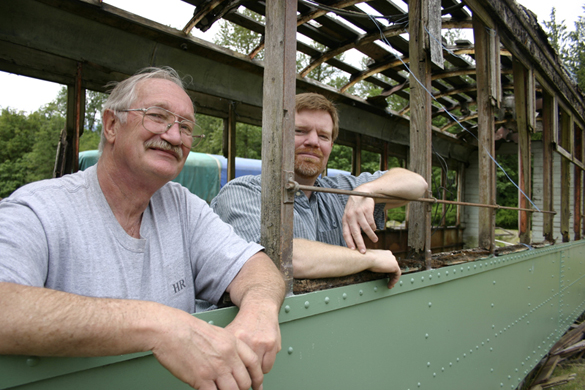 - Tom and Vince Mendenhall, father-and-son owners of Arlington, Wash.-based Historic Railway Restoration, inside a Turtleback streetcar that once operated on Tacoma streets. (PHOTO BY TODD MATTHEWS)