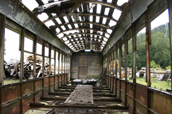 - A late-morning gray light creeps through the arched and pockmarked roof of an old Turtleback streetcar that once operated in Tacoma. Today, it sits on a 40-acre field in Rockport, Wash., and is owned by Historic Railway Restoration. (PHOTO BY TODD MATTHEWS)