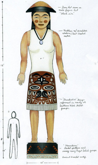 Details of the sculpture’s design are documented in a Dec. 3 memo from McBride to the city’s landmarks preservation commission. The sculpture has been submitted to the commission for design review twice — once in 2005, and again this week — because it is being sited in the Union Station Conservation District. According to the memo, the sculpture will depict a female wearing traditional clothing such as a necklace with simulated abalone, a dome hat with black rim often said to have been imported from the Makah Indians, and a Thunderbird design painted on a dance apron regalia. The pedestal will be painted to depict a mountain basket pattern and ancient bracelet motif.