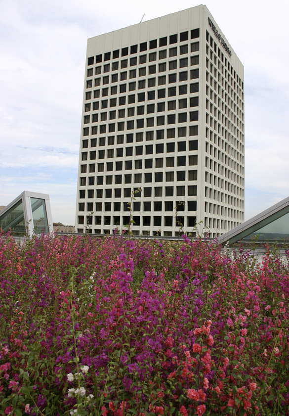 - Workers in the Wells Fargo tower on Pacific Avenue have a bird’s-eye view of the new green roof atop Pacific Plaza. (PHOTO BY TODD MATTHEWS)
