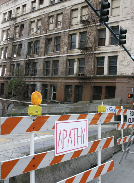 The City is taking the action under Tacoma Municipal Code 2.01.060.I, known commonly as the “Dangerous Buildings Ordinance,” which gives the City the ability to vacate a building, barricade public sidewalks and streets, secure the building from unauthorized entry, and shore up or repair the building if it believes the structure is “an imminent danger” to public safety. According to the code, if these measures still don’t address public safety concerns, the building may be demolished at the owner’s expense.