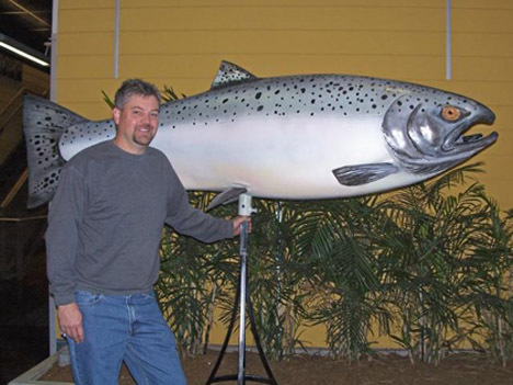 He was pleased and honored to donate his skills, and using cans of spray paint, he created a giant, lifelike Chinook salmon. It is now on display in the lobby of the Central Maintenance Facility.