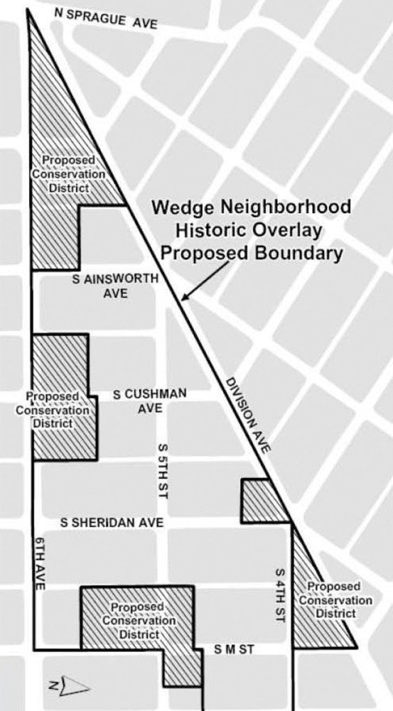 The “Wedge” neighborhood and the proposed historic district boundaries currently stretch from Sixth Avenue to Division Avenue, and L Street to Sprague Avenue. The neighborhood is within walking distance to Wright Park, the North Slope Historic District, and many of the city’s oldest churches. It also sits in the shadow of MultiCare Health System’s expansive campus.