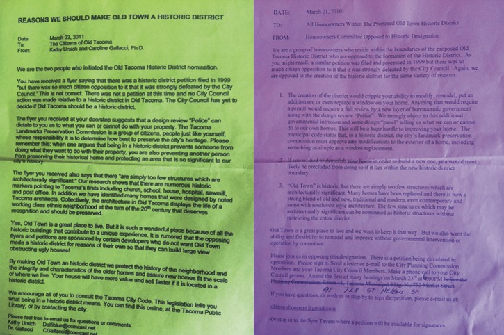 On Friday, the Tacoma Daily Index obtained copies of two letters circulated to Old Town neighbors last month. Each letter aims to persuade residents to side with one or the other side of the issue.