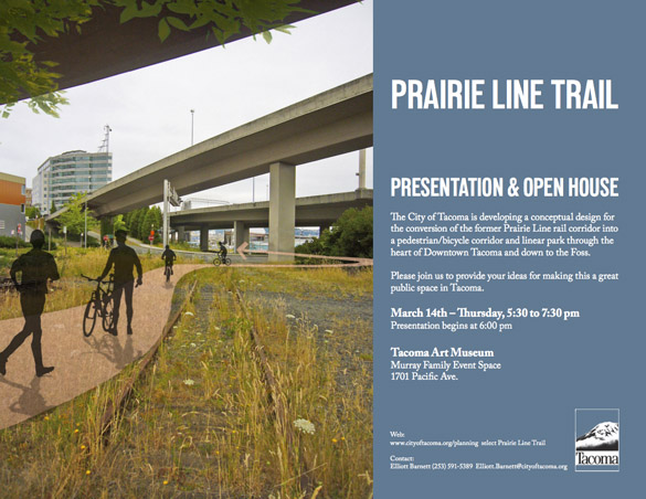 The City of Tacoma is developing a conceptual design plan for a portion of the Prairie Line Trail, a project to convert a former rail corridor into a pedestrian/bicycle trail and linear park through the heart of downtown Tacoma. As part of the public design process, the community is invited to an open house to learn about the project on Thurs., March 14 from 5:30 p.m. to 7:30 p.m. at the Tacoma Art Museum, 1701 Pacific Avenue.