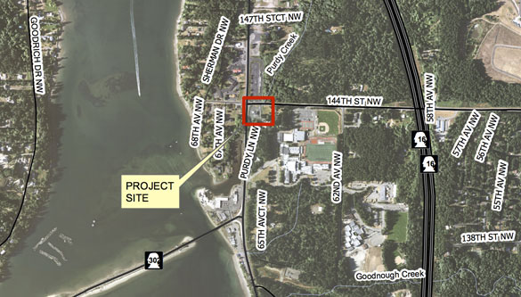 One plan calls for purchasing the Purdy Chevron gas station at 14317 Purdy Lane NW if the owner is agreeable. Pierce County would remove the building and parking lot, install a larger culvert or bridge at 144th Street NW, and create an estuary on the gas station site. Another plan calls for moving the creek approximately 200 feet east of its current location and install a larger culvert or bridge at 144th Street NW and Purdy Lane NW.