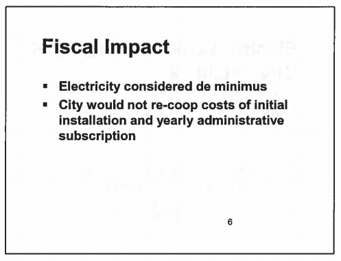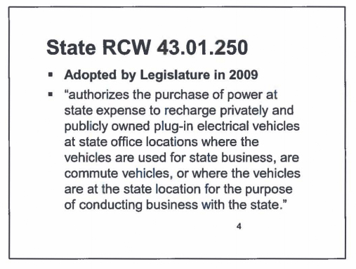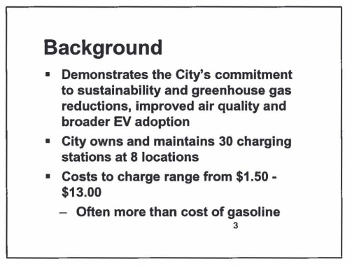 Lynett pointed to the Washington State law that allows electric vehicle owners to re-charge their vehicles at State-owned charging stations while doing business with the State of Washington. She also described the expense to the City as “de minimis.”