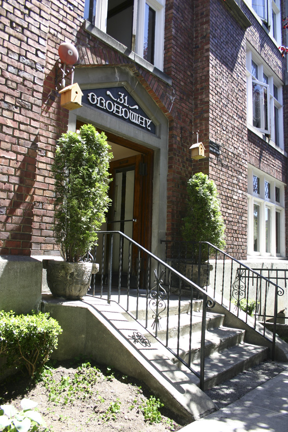 Other examples—on the second floor, a small flap door above a bathroom sink opens to a chute for dirty laundry; in the living room, a wooden grille re-purposed from an old Victrola and installed above a closet door provides ventilation for wet coats; an octagonal dining room Shaw created by adding diagonal walls at four corners (one wall opens up to reveal Clara’s former sewing cabinet); a fireplace that juts out several feet from the wall and features the hand-carved inscription, Strike A Light! The Universe Is Fireproof!, a reference to the poet and editor James Russell Lowell; a complicated (and somewhat comical) system for trapping cold air from outside by way of a grate built into a window ledge, then feeding that air into a nearby radiator; Art Deco “S” monograms (for “Shaw”) are carved into various places throughout the house; and an Art Deco plaque announcing ‘Stanley T. Shaw, Architect’ is embedded in the sidewalk outside.