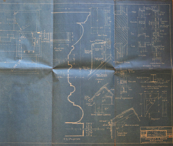 EARLIER THIS MONTH, Winters and Reid appeared before Tacoma’s Landmarks Preservation Commission to nominate their home to the city’s historic register. The couple partnered with Susan Johnson, an architectural historian at Tacoma-based Artifacts Consulting, to prepare the nomination. The team combed through library and newspaper archives, as well as an old Girl Scout Cookie box that was left behind in the home; it contained many of Shaw’s original drawings, designs, correspondence, notes, and contracts related to the work he completed on the house.