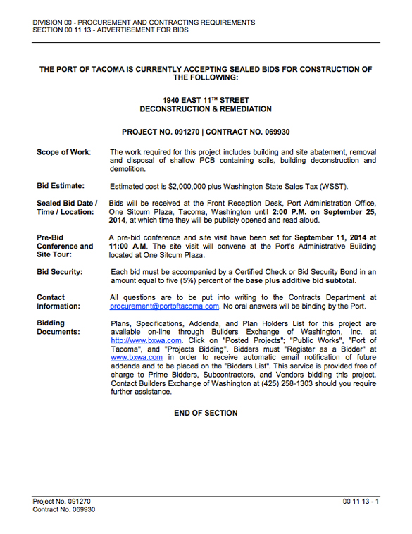 According to bid documents prepared by Port of Tacoma staff, the work will involve a high level of abatement due to polychlorinated biphenyl (PCB) and asbestos contamination found within the building and nearby soil. A steel manufacturing company was headquartered on the site, which is located at 1940 E. 11th St., prior to Brown & Haley. A pre-bid meeting and site tour will be held on Thurs., Sept. 11, at 11 a.m. The meeting and tour will begin at the Port of Tacoma Administrative Building, which is located at One Sitcum Plaza, in Tacoma. The bid deadline expires at 2 p.m. on Thurs., Sept. 25. More information is available online at portoftacoma.com.