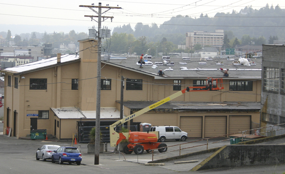 - Work is under way to replace the roof on the 104-year-old former Tacoma Municipal Barn in downtown Tacoma. The building was recently added to Tacoma’s Register of Historic Places. (PHOTO BY TODD MATTHEWS)