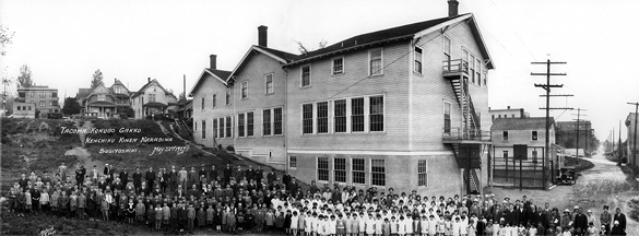 Administrators, faculty, and students gather outside the Japanese Language School in downtown Tacoma on May 22, 1927. According to University of Washington Tacoma officials, between 1911 and 1942, the school served Tacoma's thriving Japanese-American community by teaching young people the language, arts, and cultural traditions of Japan, the homeland of their parents and grandparents. (IMAGE COURTESY UNIVERSITY OF WASHINGTON TACOMA)