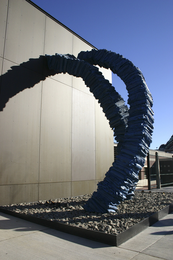 - TAM’s Rock Hushka describes “Blanket Stories: Transportation Object, Generous Ones, Trek,” an outdoor sculpture created by Marie Watt that consists of two curving towers of stacked blankets cast in bronze. (PHOTO BY TODD MATTHEWS)