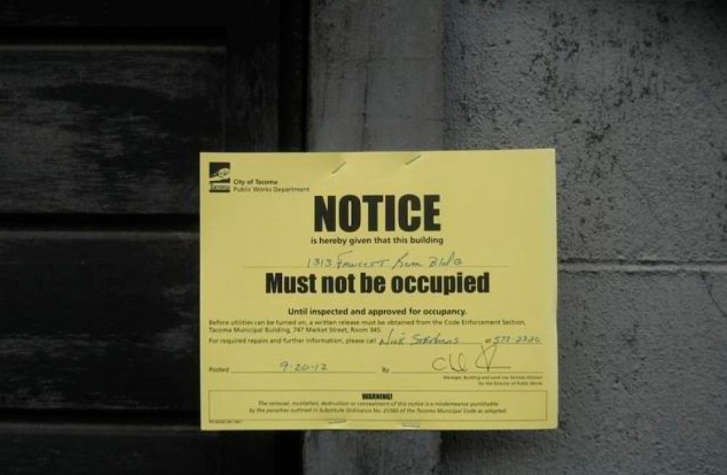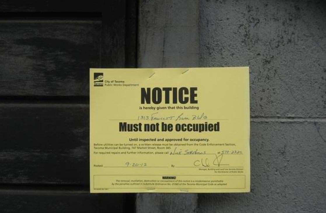 The bid documents usually include photographs of buildings in various states of ruin: piles of dirty clothes; broken furniture and fixtures; evidence of looting; yards overgrown with weeds; bright yellow signs stapled to the structures and announcing, ‘Notice. Must Not Be Occupied’; and front doors boarded over by heavy plywood with similar messages: ‘No Trespassing. Violators Will Be Arrested. Keep Tacoma Safe.’
