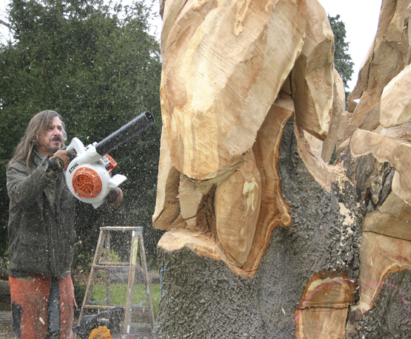 - Chainsaw sculptor Bruce ‘Thor’ Thorsteinson is turning a dead maple tree in Tacoma into a work of art. (PHOTO BY TODD MATTHEWS)