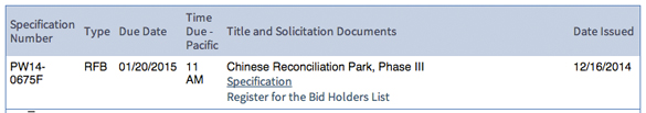 First, the City is accepting bids from contractors interested in completing the third phase of Tacoma’s Chinese Reconciliation Park, according to a legal notice published this week in the Tacoma Daily Index. Bid documents prepared by City staff show the the project will increase the size of the current parking lot by adding an additional 30 parking spaces; removing approximately 1,000 cubic yards of contaminated soil currently stockpiled on-site underneath the Schuster Parkway bridge; and installing signage, a bamboo wall with a Chinese motif, plantings, and lighting. A pre-bid meeting will be held at 10 a.m. on Weds., Jan. 7, 2015, at the Tacoma Municipal Building, located at 747 Market St., Room 148, in downtown Tacoma. The budget is estimated at $320,000. The bid deadline expires at 11 a.m. on Tues., Jan. 20, 2015. More information is available online here and here.
