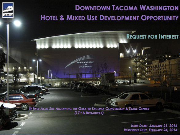 The City of Tacoma in January issued a call for developers to build a 250-room, four-star hotel that would include space for retail and parking on a nearly-two-acre site adjacent to the Greater Tacoma Convention and Trade Center in downtown Tacoma (see “Tacoma seeks developer for downtown hotel near Convention Center,” Tacoma Daily Index, Jan. 22, 2014).