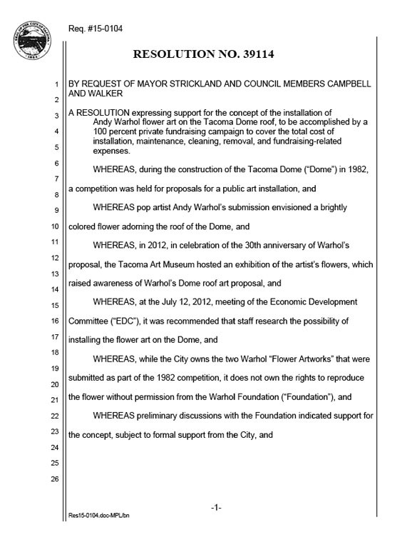 The plan dates back to 1982, when Warhol responded to a call for artists to submit proposals for public art at the Tacoma Dome, which was under construction at the time. Warhol’s plan called for painting a bright flower over the exterior of the Tacoma Dome’s roof. Although Warhol’s work was not selected, members of Tacoma’s arts community have advocated for the project ever since (see “Discussion continues on Warhol Tacoma Dome roof plan,” Tacoma Daily Index, April 17, 2014). While the City owns the work Warhol submitted more than 30 years ago, it does not own the rights to reproduce the flower without permission from the Warhol Foundation. According to City staff, however, preliminary discussions between the City and the Warhol Foundation show mutual support for the proposal.
