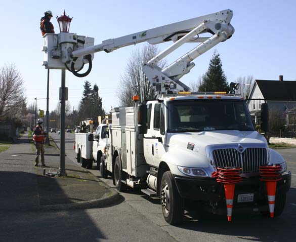 Crews are installing light-emitting diode (LED) street lights in Tacoma's Lincoln International Business District this week. (PHOTO BY TODD MATTHEWS)