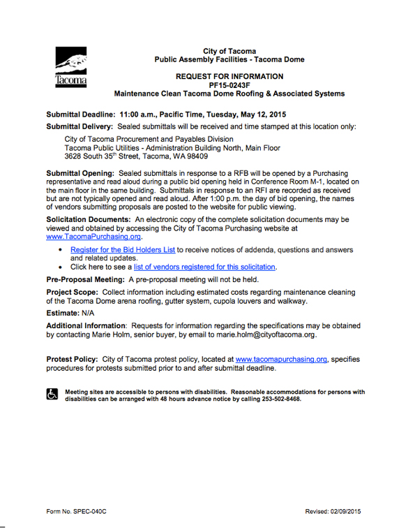 TACOMA DAILY INDEX: Why has the City issued the RFI this month to clean the roof of the Tacoma Dome?