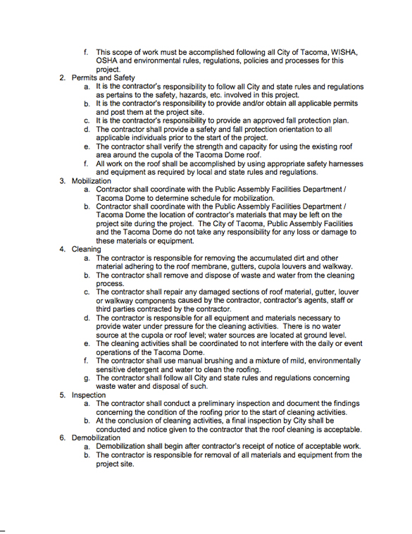 According to a legal notice published this month in the Tacoma Daily Index and Request For Information (RFI) documents prepared by City staff, the City plans to collect information regarding the maintenance and cleaning of the arena’s roof, gutter system, cupola louvers, and walkway, as well as establish a list of contractors interested in the project should the City decide to put the job out for bid at a later date.