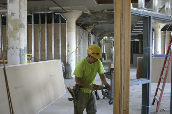 The renovation of the project started around the first of this year. [This] is an extremely old, [nearly] 100-year-old building, so there was a lot of demolition and abatement to remove all of the hazardous material, plus anything that we weren’t going to use in the project. It was a Salvation Army, then it turned into kind of a hodgepodge of commercial uses. When we took ownership, it was also being used as a flophouse. There were a number of tenants actually living in here. We had the ‘enjoyment’ of relocating those folks to start the process. The original construction was pretty much intact—all of the original columns of the building, the exterior is all original, the brick is all original. We tried to salvage that as much as possible. The space was very chopped up because it was a number of different commercial uses. As we went through the building, it was very small, chopped up office spaces or ‘apartments.’ There were a couple marijuana grow shops right up above us and down on the other side of the building. The basement downstairs was fairly open. We did have to remove walls and such down there. But this big openness, it was not like this. There were walls between all the columns. We were able to use the original elevator shaft, so we are repurposing that and putting in a new elevator. We’ll have a three-story stairwell on the back of the building that will be accessible to each floor.