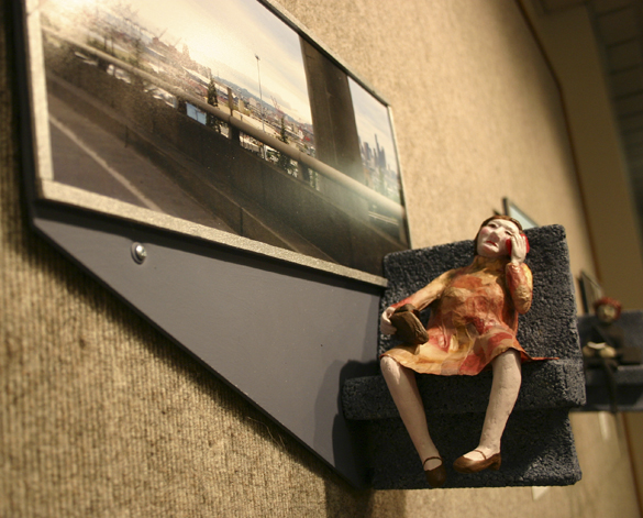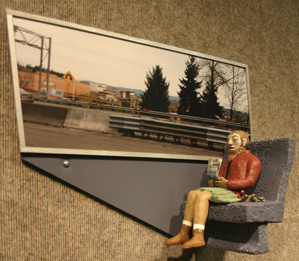 Riding the express bus Seattle/Tacoma consists of 14 vignettes of three-dimensional 10-inch, wall-mounted figures seated next to photographs of landmarks Di Nino captured on her smart phone while traveling via Sound Transit’s Route 590/594 Express bus service. Di Nino and the exhibit were featured in the Tacoma Daily Index in June (see “Artist Lynn Di Nino’s creative commute,” Tacoma Daily Index, June 5, 2015; and “Tacoma Daily Index Top Stories — June 2015,” Tacoma Daily Index, July 1, 2015).