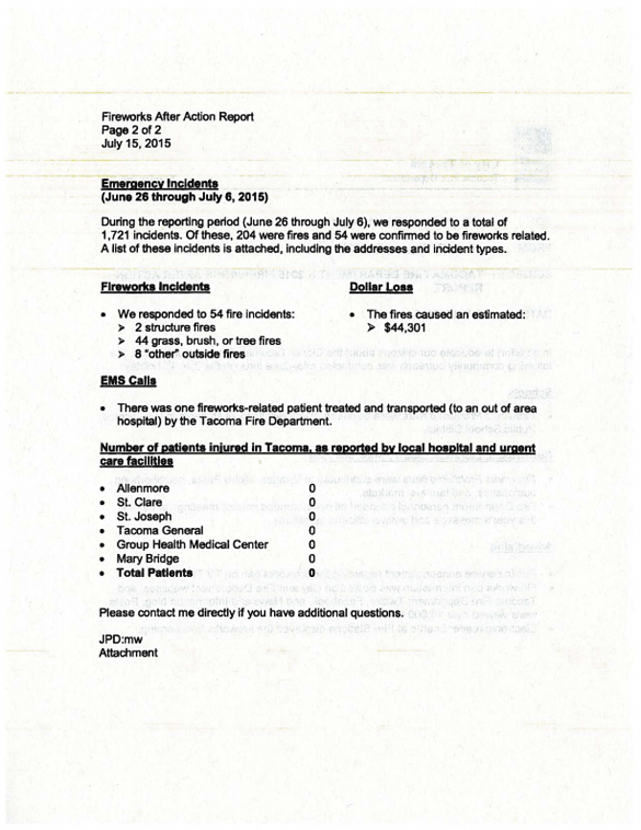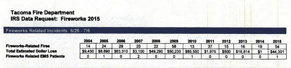 According to the Tacoma Fire Department’s 2015 Fireworks After Action Report dated July 15, Tacoma firefighters responded to a total of 1,721 incidents between June 26 and July 6. Of these incidents, 204 were fires and 54 were confirmed to be fireworks-related. Of the 54 fireworks-related incidents, there were two structure fires, 44 grass/brush/tree fires, and eight “other” outside fires. The fires caused nearly $45,000 in damages. One fireworks-related patient was treated and transported to an area hospital. The most expensive fireworks-related fire involved approximately $40,000 in damages due to a structure fire in the 1200 block of South 13th Street, according to the report.
