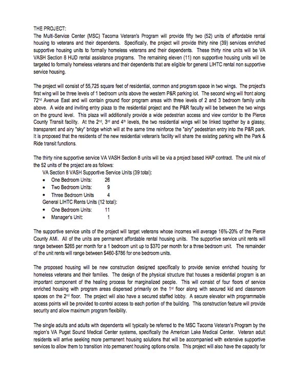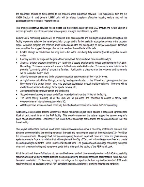 The building, which would consist of two wings, is designed to be connected by a pedestrian skybridge. The proposal also calls for computer centers and support service program areas for residents, as well as a kiosk with coffee and light food fare to be operated by Multi-Service Center’s Tacoma Veteran Program participants during peak transit times. Design plans also show a separate, two-story building with parking for 22 vehicles.