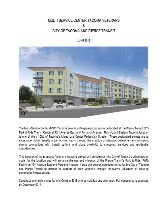 The non-profit Multi-Service Center has submitted a proposal to Pierce Transit that calls for the development of a four-story, 55,725-square-foot building (pictured below) that would offer 52 one-, two-, and three-bedroom units of affordable rental housing to homeless veterans and their families at the 72nd Street Transit Center and Park-and-Ride, located at 1319 E. 72nd St., in Tacoma. Thirty-nine units would be set aside for Veterans Affairs Supportive Housing (VASH) Section 8 Housing and Urban Development (HUD) rental assistance program participants, with rents ranging from $265 per month for a one-bedroom unit to $370 per month for a three-bedroom unit. The remaining units (all one-bedroom) would be available for $460 to $786 per month.
