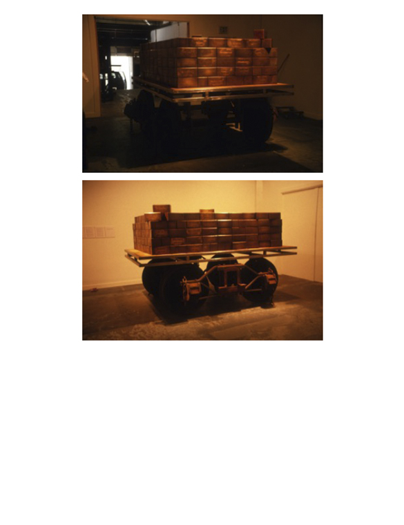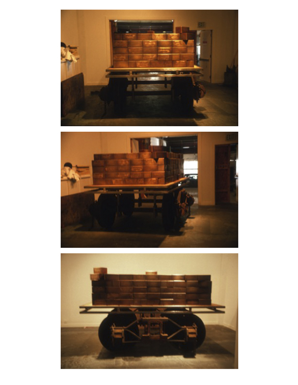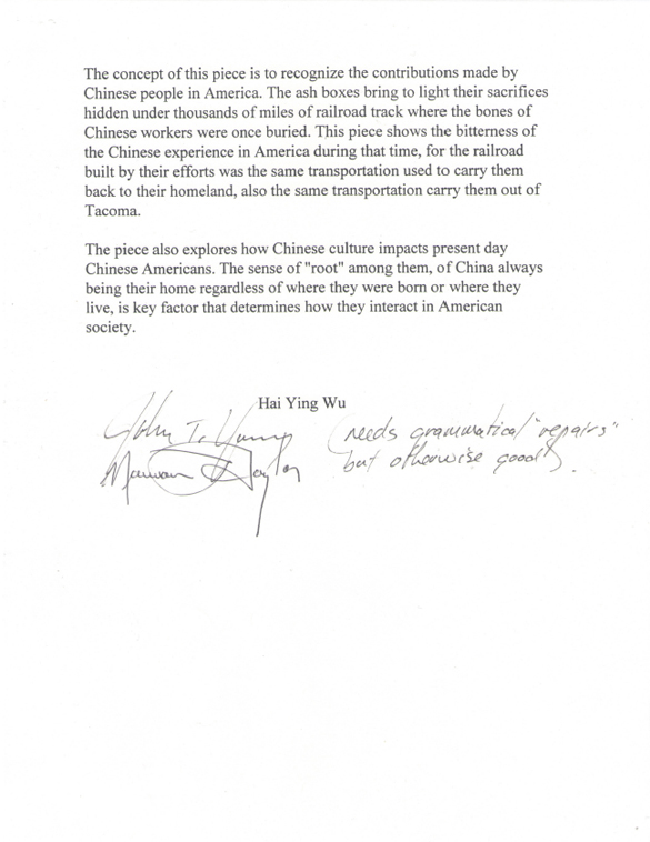 “The concept of this piece is to recognize the contributions made by Chinese people in America,” wrote Wu in his artist’s statement (see below). “The ash boxes bring to light their sacrifices hidden under thousands of miles of railroad track where the bones of Chinese workers were once buried. This piece shows the bitterness of the Chinese experience in America during that time, for the railroad built by their efforts was the same transportation used to carry them back to their homeland, also the same transportation [that] carr[ied] them out of Tacoma.”