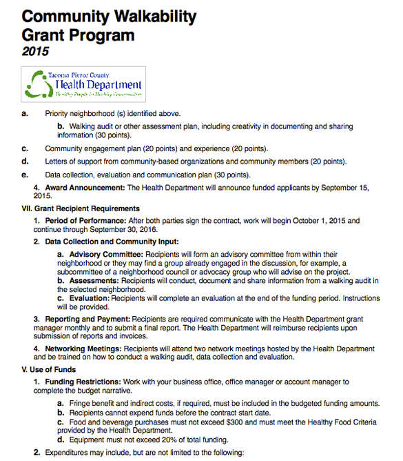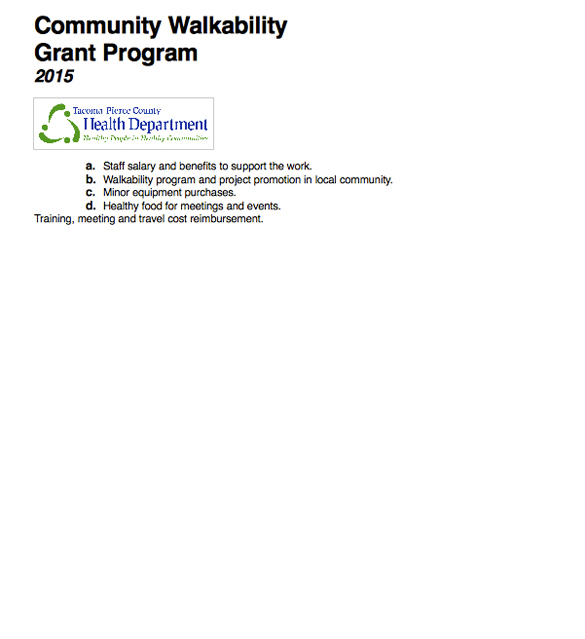 The City of Tacoma has applied for a $10,000 grant from the Tacoma-Pierce County Health Department as part of the organization’s 2015 Walkability Grant Program, according to Tacoma City Manager T.C. Broadnax’s most recent weekly report to Tacoma City Council.
