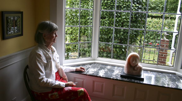- Homeowner Lari Ryan sits near a bay window salvaged from the circa-1889 Hewitt House and repurposed in the dining room of the Mead House. (PHOTO BY TODD MATTHEWS)
