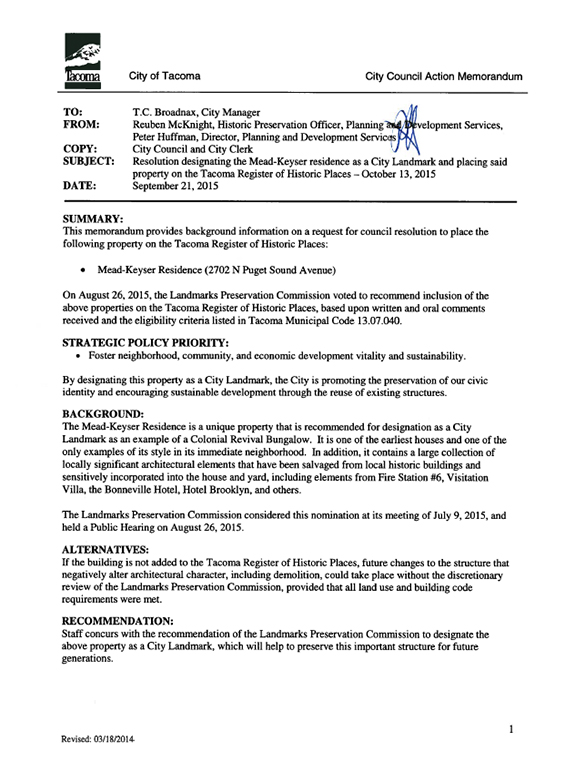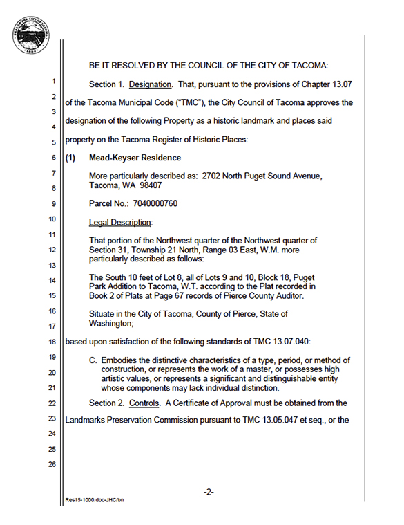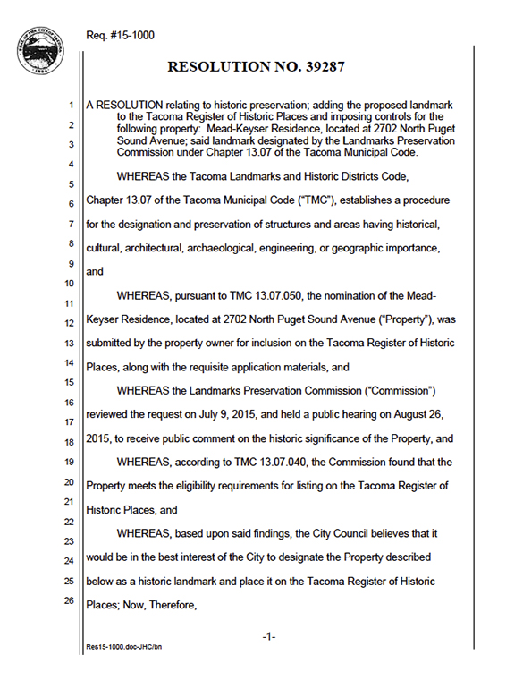 UPDATE | FRI., OCT. 9 @ 10:50 A.M. — It’s official. A resolution to place the Mead-Keyser Residence on the City of Tacoma’s Register of Historic Places is on Tacoma City Council’s agenda for Tues., Oct. 13. A copy of the resolution is available online here. A copy of the staff memo is available online here. A map is available online here. The documents are also posted below: