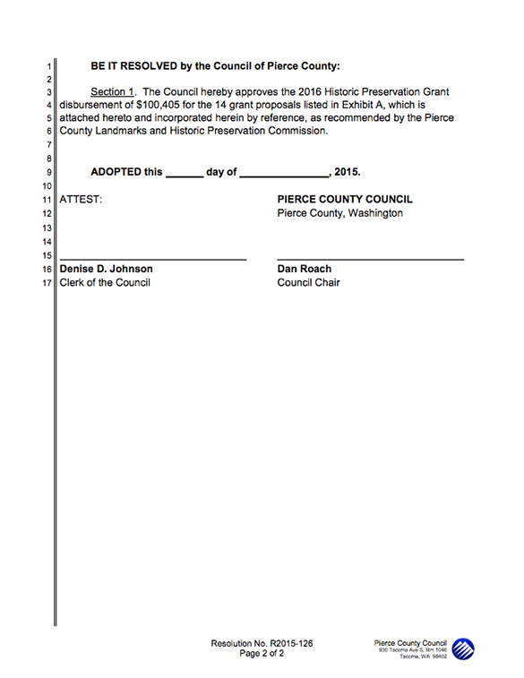 The funding is part of the Pierce County Landmarks and Historic Preservation Commission’s preservation grant program, which encourages countywide non-profit organizations, public agencies, and owners of properties listed on local historic registers to apply for grants to help pay for historic preservation or history-related projects. Funds are provided by Washington State legislation enacted in 2005 that directs one dollar of a five-dollar filing fee toward historic preservation and historical programming.