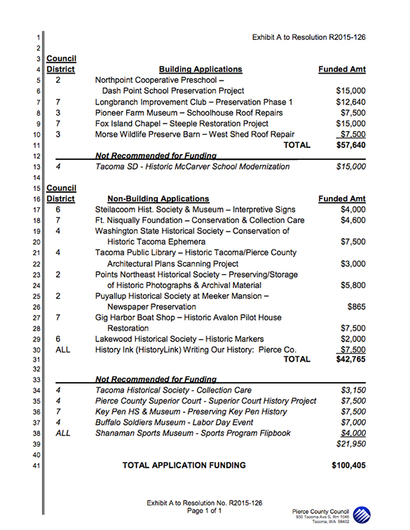 This year’s application deadline expired in July. Pierce County’s Landmarks and Historic Preservation Commission received 20 grant applications, and evaluated those applications during public meetings in July and August, according to documents prepared by Pierce County staff. The commission recommended 14 applications share $100,405 in grant funding, while six applications were not recommended for funding.