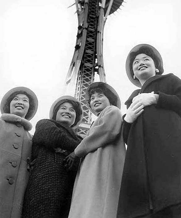 - Japanese American Seafair royalty pose in front of the Space Needle, still under construction, in Seattle on Nov. 18, 1961. (ELMER OGAWA PHOTOGRAPH / COURTESY UNIVERSITY OF WASHINGTON LIBRARIES SPECIAL COLLECTIONS)