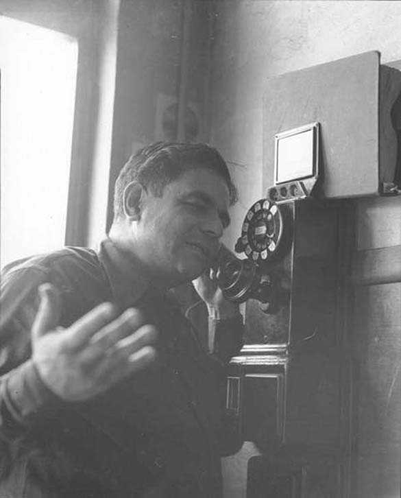 Bromberg continues to sift through Ogawa’s work, landing on more self-portraits. There is a studio-quality photo of Ogawa: clean-shaven, hair combed, and wearing a gray suit, gracefully leaning in toward the camera. Two 1956 prints show Ogawa dressed as some sort of private detective straight out of a pulp crime novel (fedora, heavy trench coat, neatly trimmed mustache) and holding a camera near his face as he waits for the next surreptitious shot. Another photograph presents Ogawa curled up on a sofa, dressed in dark pinstriped slacks and a long-sleeved dress shirt, presumably napping, yet holding a drink in his left hand. And, finally, a candid shot displays Ogawa in what appears to be an intense conversation at a pay phone at one of the local bars, waving his right hand, cupping the earpiece with his left hand, and speaking into the phone’s snoutlike microphone.