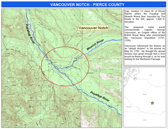 The application was forwarded to the Board of Natural Resources, which approved the proposal in December (see “Vancouver Notch: DNR approves proposal to name Mount Rainier foothills feature,” Tacoma Daily Index, Dec. 1, 2015; and “Vancouver Notch: DNR Board to vote on proposal to name Mount Rainier foothills feature,” Tacoma Daily Index, Nov. 20, 2015). Names approved by the Board are published in the Washington Administrative Code and forwarded to the United States Board on Geographic Names for federal consideration along with the state’s recommendations.