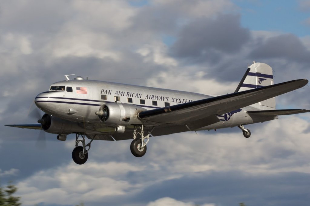 The Historic Flight Foundation’s Douglas DC-3 has a storied history. It began as a military cargo aircraft flying over the Himalayas in WWII, then as an airliner in China, and finally as a VIP transport for Johnson & Johnson, among others. The interior is the original VIP configuration from 1953. The exterior reflects the civilian services of the DC-3 with Pan Am.