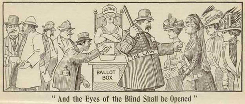 Image credit: Political cartoon, printed in Votes for Women, Volume 1 #4, March 1910, page 1, published by the Washington Equal Rights Suffrage Association, Seattle, Washington, continued under the title New Citizen. The cartoon shows five placing votes in a ballot box, while a bind-folded woman justice symbol presides and a police officer wields a club to prevent four women and a young girl from voting. Represents the idea of voters who may be blind to inequality and voter suppression. Collection of Washington State Historical Society, catalog ID 2000.104.38.2.1.