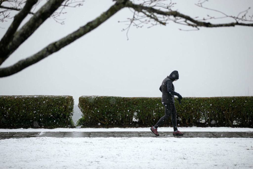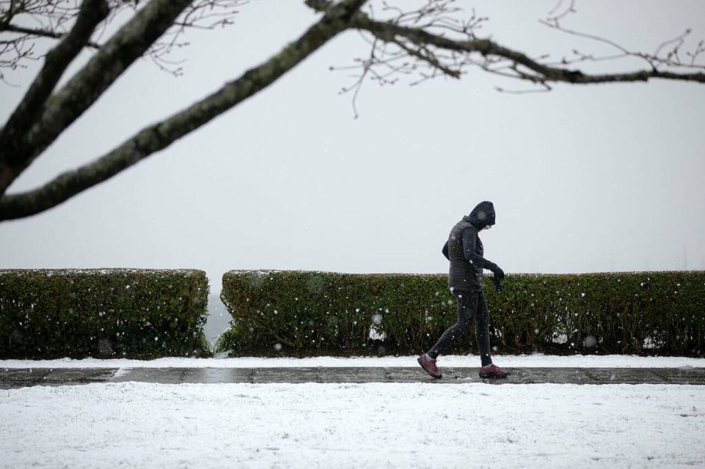 A pedestrian walks through Grand Avenue Park as a light snow comes down Tuesday, Feb. 28, 2023, in Everett, Washington. (Ryan Berry / The Herald)