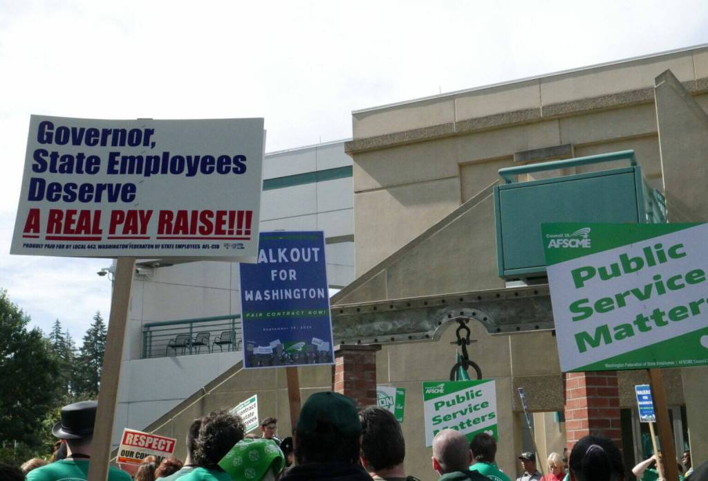 State employees gathered outside the Labor and Industries Building in Tumwater Sept. 10 as part of a statewide walkout to demand fair wages and safe staffing levels.