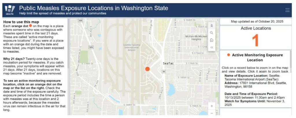 But on Oct. 13, an unvaccinated visitor from Arizona who had measles traveled through Seattle-Tacoma International Airport, the only location listed on the new state map launched this week. Travelers who were at the airport between 11:30 a.m. and 2:40 p.m. that day should watch for symptoms until Nov. 3. The incubation period for measles is 21 days.