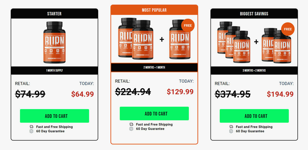Burn by Capsiplex is priced at $64.99 per bottle. Each bottle contains a one month supply (90 capsules). You take three capsules daily to cut away fat.