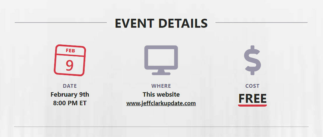 Jeff Clark’s New Trading Breakthrough is free for anyone to attend. The event is scheduled for Thursday, February 9 at 8pm ET.