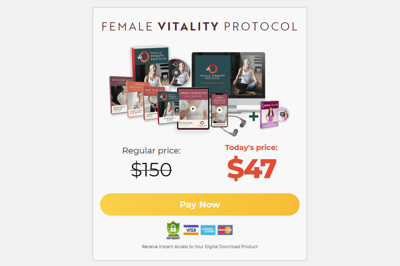Female Vitality Protocol is priced at a one-time fee of $47. You pay the fee today, then get instant access to the program and all included bonus materials.