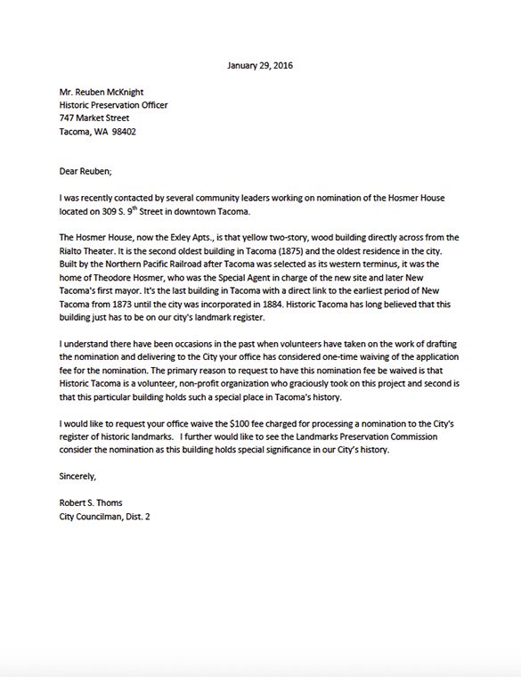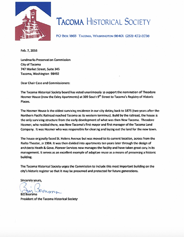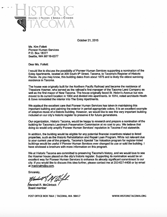 McClintock and Historic Tacoma sent a letter to Pioneer Human Services on Oct. 21, 2015, to gauge the company’s interest in adding the Hosmer House to Tacoma’s historic register. Historic Tacoma did not receive a response, McClintock told the commission last week. In January, Historic Tacoma submitted the landmark nomination to the City of Tacoma’s Historic Preservation Office.