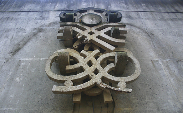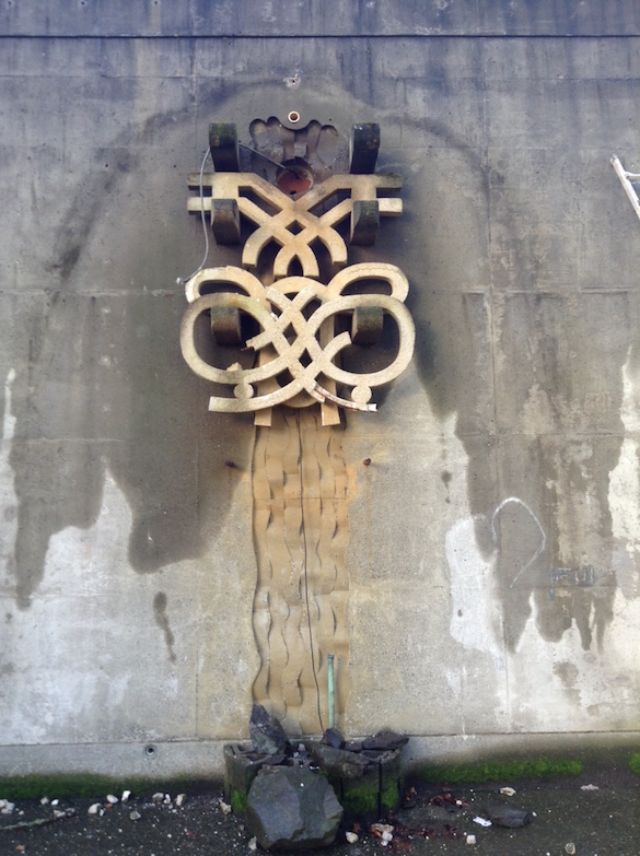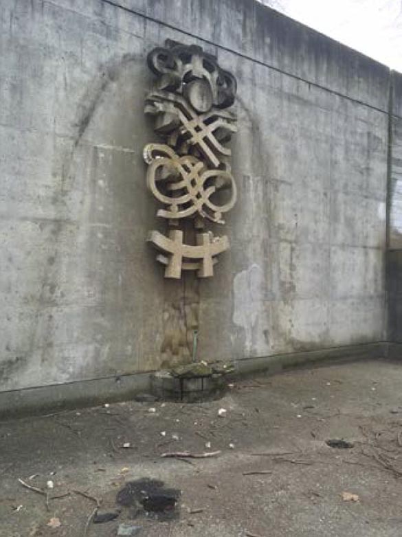 The wall-mounted Untitled (Concrete Sculpture) was commissioned by Bob Price Architecture Co. and created by Harold Balazs in 1976 as part of a courtyard fountain at the Bicentennial Pavilion located near South 13th Street and Market Street. Balazs’s work is on display throughout Washington State, including Riverfront Park in Spokane; the Federal Building in downtown Seattle; the Temple Beth El synagogue building in Tacoma; and the former Puget Sound Bank (now KeyBank) in University Place. Six years ago, University of Washington Press published a book about Balazs that coincided with exhibits of his work at museums in Spokane, Pullman, and La Conner.